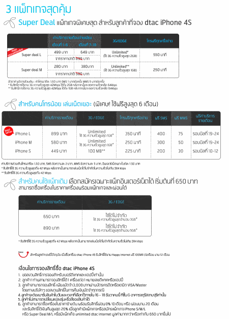 วันนี้ (13 ธันวาคม ) AIS และ dtac เริ่มเปิดจอง iPhone4S เป็นวันแรก หลังจากที่ truemove H ได้เปิดจองเป็นค่ายแรกก่อนใครเพื่อนเมื่อวันที่ 9 ธันวาคมที่ผ่านมาพร้อมกับแพคเกจของทาง truemove H เอง
