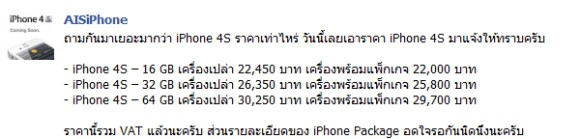 หลังจาก truemove H เผยข้อมูลราคา iPhone4s และเปิดจองทันที ทาง AIS ก็ตามมาติดๆเหมือนกัน โดยได้แจ้งผ่านทางลูกค้าที่ขอรับข่าวสาร iPhone4S จาก AIS แล้ว และแล้วก็ได้เผยข้อมูลราคาทั้งเครื่องเปล่า และเครื่องพร้อมแพคเกจของ AIS ผ่านทาง Facebook แต่ทว่าราคาแพคเกจเริ่มเห็นความต่างกันแล้ว