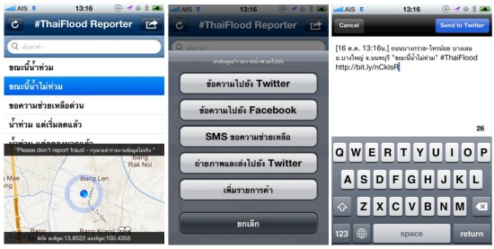 แอพนี้สำหรับส่งรายงานน้ำท่วมในประเทศไทยผ่านทาง twitter และ sms โดยจะทำการส่งตำแหน่ง ที่อยู่ และเวลาขณะรายงาน รวมถึงภาพถ่ายไปยัง Twitter พร้อมกับแท็ก #ThaiFlood นอกจากนี้ยังสามารถส่ง SMS ไปยังบริการ 4567892 ของกระทรวง ICT ได้ โดยแอพจะช่วยระบุตำแหน่งของท่านด้วย อย่างแม่นยำ ทั้งนี้อุปกรณ์ iOS ของท่านจะต้องเปิด Location เพื่อให้แอพนี้สามารถระบุตำแหน่งพิกัดของคุณโดยอัตโนมัติ เหมาะสำหรับช่วยแจ้งเตือนเพื่อนๆ หรือขอความช่วยเหลือ
