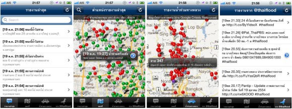 แอพรายงานข้อมูลสถานการณ์น้ำท่วมในประเทศไทย สามารถดูแผนที่ว่าบริเวณไหนของประเทศมีน้ำท่วมบ้าง โดยจะแสดงจุดที่น้ำท่วมอยู่เป็นหมุดสีแดง และจุดที่น้ำไม่ท่วมเป็นจุดสีเขียวบนแผนที่ รวมถึงแสดงเส้นทางหลวงที่ถูกน้ำท่วม เพื่อเลี่ยงเส้นทางจราจรทางนั้น และมีรายงานจากทวิตของ @thaiflood ด้วย