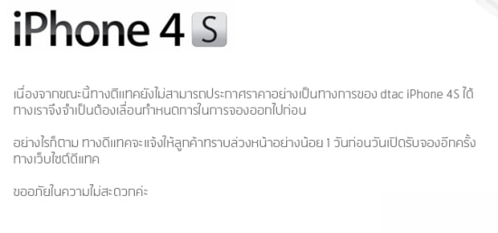 ตามกำหนดแล้ววันนี้จะเป็นวันจอง iPhone4S ของดีแทค ซึ่งถ้าเปิดจองจริงจะเป็นค่ายแรกที่เปิดจองทันที แต่ทว่าวันนี้คนที่จะจองคงต้องรอต่อไปอีก เพราะความไม่พร้อมในเรื่องข้อมูลของดีแทคที่ยังไม่ได้คำตอบเรื่องราคาจำหน่ายที่ชัดเจน และนี่คือประกาศจากหน้าเว็บไซต์ดีแทค