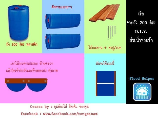 วิธีการทำเรือ นำถังพลาสติก 200 ลิตร มาผ่าครึ่ง แล้วเอาไม้กระดานทาบประกบหัวท้าย ก็จะได้เรือขนาด 2 ที่นั่ง แล้ว