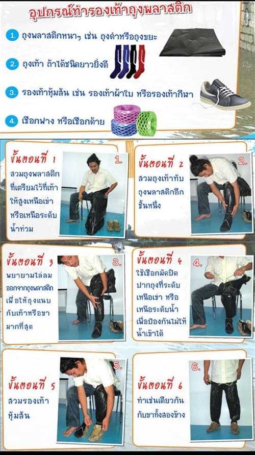 รองเท้าบูท ก็เป็นสิ่งจำเป็นที่ไว้ใช้ในการเดินทางฝ่าลุยน้ำท่วม หากไม่ได้ใส่รองเท้าบูมนี้ อาจทำให้เชื้อโรคที่มากับน้ำท่วมนี้เข้าสู่ร่างกายเป็นอันตรายได้ เช่น โรคฉี่หนู น้ำกัดเท้า เชื้อรา บาดทะยัก เป็นต้น แม้ว่าราคามีให้เลือกหลายแบบทั้งราคาถูก จนถึงราคาแพง แต่ด้วยรองเท้าบูทนี้หาซื้อยาก เพราะเป็นที่ต้องการของหลายๆคนในช่วงนี้จนสินค้าขาดตลาด ดังนั้นก็มีเทคนิคการทำให้ดูคล้ายรองเท้าบูทเพื่อป้องกันโรคที่มากับน้ำท่วมนี้ด้วยการทำ “รองเท้าถุงพลาสติก” หรือรองเท้าบูทที่ทำจากถุงพลาสติก ป้องกันโรคฉี่หนู ซึ่งสามารถทำได้ง่ายเพียงเตรียมเชือก ถุงพลาสติกแบบใบใหญ่และยาวสักหน่อย ถุงเท้ายาว และรองเท้าหุ้มส้น แล้วทำตาม 6 ขั้นตอนด้านบนนี้ ก็จะได้เป็น รองเท้าถุงพลาสติก ป้องกันโรคฉี่หนู แทนรองเท้าบูท มาใช้ลุยน้ำในช่วงน้ำท่วมนี้ได้