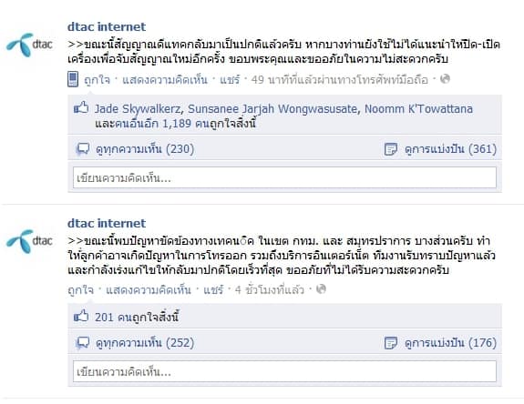 และใน facebook ของ dtac ก็มีแต่ลูกค้าที่สอบถามเกี่ยวกับสัญญาณล่มที่ยาวนานกว่า 4 ชั่วโมง บางรายถึงกับเรียกร้องให้ dtac รับผิดชอบกับเหตุการณ์ที่เกิดขึ้นกับลูกค้าในวันนี้ด้วย บางรายก็ใช้สำนวนยอดฮิตที่ว่า “เมื่อก่อนก็มั่นใจใช้ดีแทคจนโดนธนูปักที่เข่า” , บนโลก twitter บางรายก็แซวว่า เป็น Viral Marketing “Disconnect To Connect” เป็นต้น