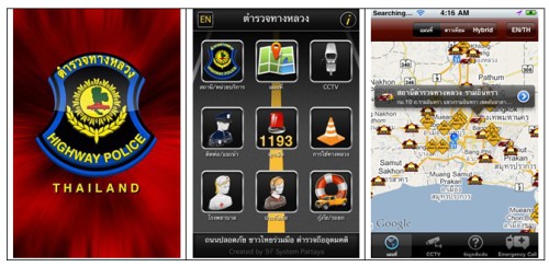 ยังมีอีกหนึ่ง application ที่น่าจะช่วยในการเดินทางได้ดี โดยเฉพาะอย่างยิ่งเมื่ออยู่ต่างจังหวัด ก็คือโปรแกรมประยุกต์ “Highway Police (Thailand)” ที่กองบังคับการตำรวจทางหลวงมีไว้ให้บริการประชาชน สำหรับท่านเจ้าของมือถือ iPhone และสมาร์ทโฟนที่ใช้ระบบปฏิบัติการAndroid