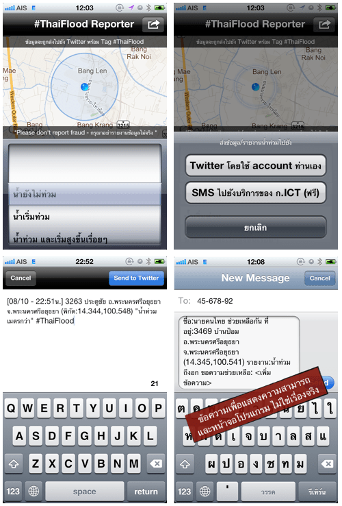 ส่วนสำหรับ iOS นั้น ก็มีแอพรายงานน้ำท่วมแล้ว ชื่อว่า Thai Flood Reporter เป็นแอพที่ให้คุณแจ้งรายงานสภาพน้ำท่วม โดยจะส่งตำแหน่งที่อยู่และเวลาขณะรายงาน รวมถึงภาพถ่ายและ Hashtag #thaiflood ไปยังทวิตเตอร์ และมีส่ง SMS ไปยังกระทรวงไอซีที เพื่อขอความช่วยเหลือจากเหตุน้ำท่วมได้ด้วย ผลงานโดย @rawitat หาโหลดมาติดตั้งบน iPhone และ iPad ได้ทาง App Store หรือคลิกที่นี่