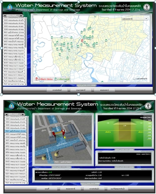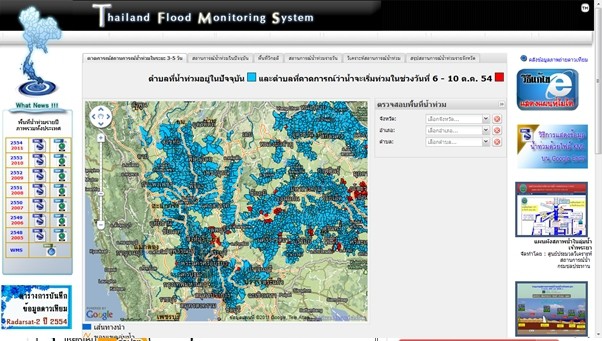 Flood.gistda.or.th โดยสำนักงานพัฒนาเทคโนโลยีอวกาศและภูมิสารสนเทศ (องค์การมหาชน)เป็นเว็บไซต์แสดง ข้อมูลแผนที่รายงานคาดการณ์สถานการณ์น้ำท่วม (Thailand Flood Monitoring System ) โดยจะแสดงสีฟ้าบนแผนที่ตามจังหวัดต่างๆที่ถูกน้ำท่วมแล้วและจังหวัดที่คาดว่าจะได้รับผลกระทบด้วย ซึ่งเว็บไซต์นี้อยู่ในระหว่างการวิจัย แต่เปิดให้ประชาชนได้ใช้บริการ