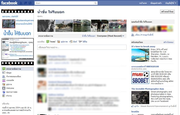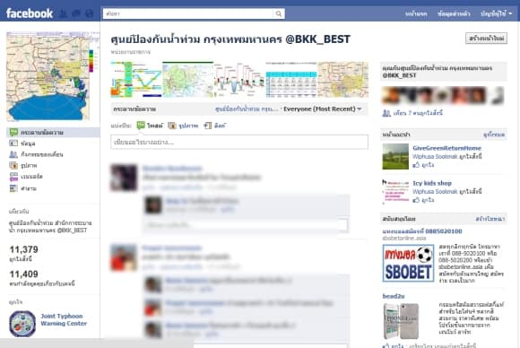 Facebook Pageน้ำขึ้นให้รีบบอก (http://www.facebook.com/room2680) เป็นการรายงานสถานการณ์น้ำท่วม และแจ้งขอความช่วยเหลือ โดยชาว facebook ได้รายงานจากสถานที่จริง หรือจากผู้ประสบอุทกภัยโดยตรง หากได้อ่านหน้าแสดงความคิดเห็นแล้วจะรู้ถึงสภาพของชาวบ้านที่ได้รับผลกระทบจริงๆ facebook page นี้เพิ่งตั้งขึ้นเมื่อวันที่ 6 ตุลาคมที่ผ่านมา เพียง 3 วันก็มีผู้เข้าไปกด like ร่วมรายงานสถานการณ์แล้วกว่า 77,000 คน