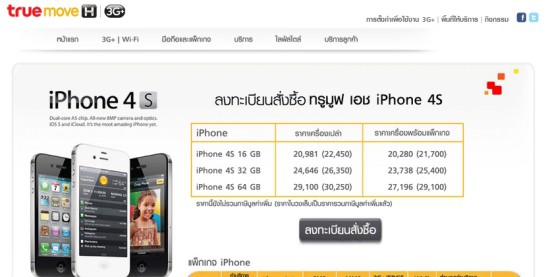 รายงานล่าสุดหลังจากที่ dtac ยังไม่ทราบราคาแน่ชัดจนประกาศเลื่อนจอง ล่าสุด truemove H ได้ประกาศเผยราคาและเปิดจองสั่งซื้อ iPhone 4S ผ่านทางหน้าเว็บไซต์ แล้ว กลายเป็นค่ายแรกที่เปิดจอง iPhone4S ในไทย