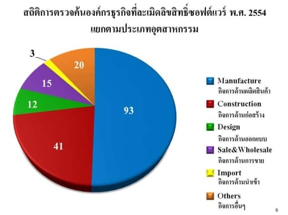 โดยแต่ละแห่งมีมูลค่าสินทรัพย์โดยรวมอย่างน้อย 100 ล้านบาท และมีองค์กรธุรกิจ 15 แห่งจากทั้งหมด มีรายได้ต่อปีมากกว่า 1,000 ล้านบาท มีองค์กรธุรกิจสัญชาติอเมริกันสองแห่งที่ถูกตรวจค้น และพบว่ามีมูลค่าการละเมิดลิขสิทธิซอฟต์แวร์ถึง 1.61 ล้านบาท