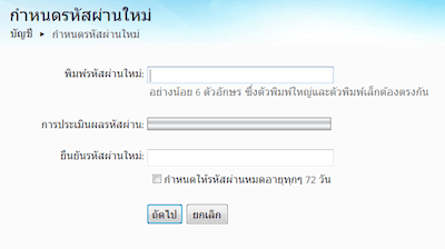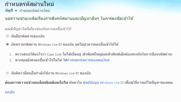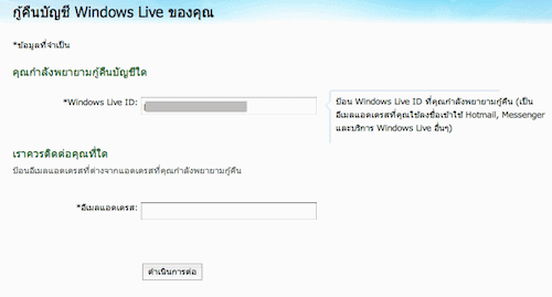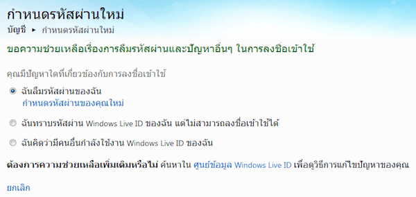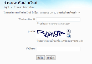 และเมื่อจำเป็นต้องกำหนดรหัสผ่านใหม่ ก็จะเข้าสู่หน้ากำหนดรหัสผ่านใหม่ ที่มีขั้นตอนง่ายๆ โดยใส่ชื่อ Windows Live ID หรือก็คือ Username ของ Hotmail ของคุณ แล้วก็ใส่ตัวอักษรที่แสดงขึ้นมาในรูปภาพ แล้วก็กดปุ่ม “ถัดไป”