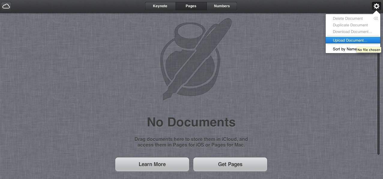 จากนั้น ก็เลือกทีละโปรแกรม คือ Pages, Numbers และ Keynote แล้วอัพโหลดไฟล์เอกสารของเราขึ้นไปครับ เท่านี้ก็จบแล้ว วิธีการอัพโหลดก็ง่าย แค่คลิกแล้วลากไฟล์ไปวางในหน้าเว็บ มันก็จะอัพโหลดเลย หรือจะคลิกที่ไอคอนรูปฟันเฟือง แล้วเลือก Upload Document ก็ได้ครับ