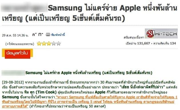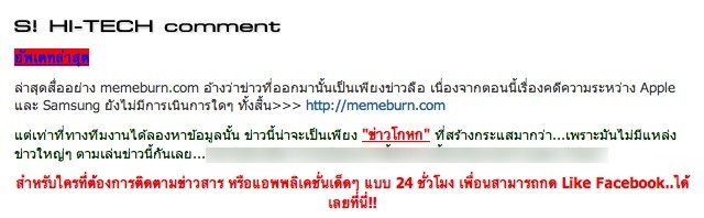 อย่างกรณีข่าว Samsung ปลอมๆ ที่ว่านี้ เว็บ Sanook.com ก็ได้มีการอัพเดตให้ได้ทราบกันว่า ข่าวนี้น่าจะเป็นข่าวโกหกนะครับ (จริงๆ ข่าวนี้พิสูจน์ได้อยู่แล้วว่าโกหก เพราะศาลเขายังไม่ได้พิพากษาเลย เป็นแค่คำตัดสินจากคณะลูกขุนเท่านั้นเอง แล้วใครเขาจะไปจ่ายเงินกัน … นอกจากนี้ คิดหรือว่า Samsung จะไม่ขออุทรณ์?!?)