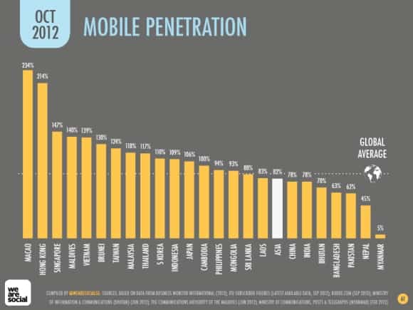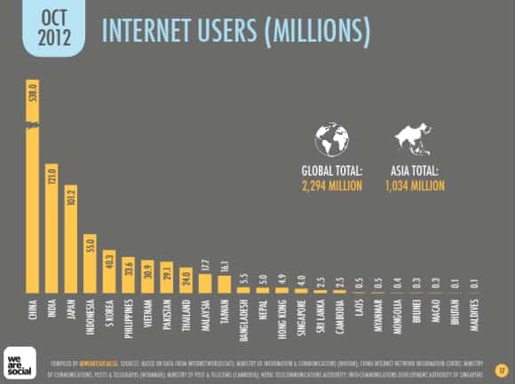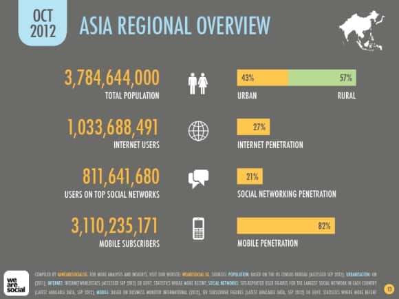 We Are Social ได้คาดการตัวเลขผู้ใช้ Facebook ในเอเชียที่ 229 ล้านราย แต่จากข้อมูลใน Socialbakers พบว่ามีตัวเลขผู้ใช้ facebook ในเอเชีย มากถึง 242 ล้านราย ทางด้านผลสำรวจจำนวนเบอร์โทรศัพท์มือถือในเอเชีย ตอนนี้มีมากถึง 3.1 พันล้านเบอร์ แต่มีการใช้จริงอย่างต่อเนื่อง 844 ล้านเบอร์ ผู้ใช้โทรศัพท์มือถือในเอเชีย 794 ล้านเบอร์นี้ มีการใช้งานในด้าน Mobile Internet ด้วย รายละเอียดข้อมูลทั้งหมดสามารถอ่านได้ที่สไลด์ด้านล่าง