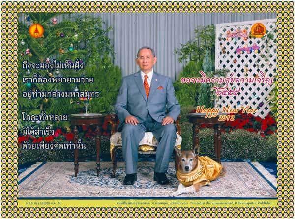 ตรงกลาง ส.ค.ส.ด้านขวามีข้อความจากบทพระราชนิพนธ์เรื่องพระมหาชนก ซึ่งเป็นคำตอบที่พระมหาชนกทรงตอบนางมณีเมขลาว่า “ถึงจะมองไม่เห็นฝั่ง เราก็ต้องพยายามว่ายอยู่ท่ามกลางมหาสมุทร โภคะทั้งหลาย มิได้สำเร็จด้วยเพียงคิดเท่านั้น”