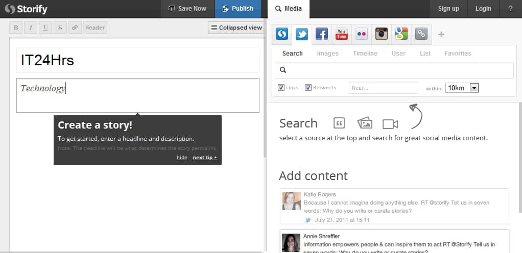 โดยใน Storify editor คุณสามารถค้นหาข้อมูลต่างๆจาก social media ในเครือข่ายต่างๆ เกี่ยวกับเรื่องราวที่คุณกำลังบอกเล่า ไม่ว่าจะเป็นการดึงข้อมูลจาก Twitter, Facebook, YouTube, Flickr, Instagram และเครือข่ายอื่นๆ เพื่อรวมรวบมาเล่าเป็นเรื่องราวของคุณเอง ถ้าเป็นข้อความที่มีคนพูดถึงคุณ ก็จะยกมาทั้งข้อความเพื่ออ้างอิงเจ้าของโพสด้วย วิธีการง่ายๆในการสร้าง Storify ของคุณ โดยการลากข้อความที่สนใจจาก Social Network ด้านขวา มาวางทางด้านซ้ายซึ่งเป็น Storify ของเรา นอกจากนี้ยังสามารถเพิ่มเติมข้อความบรรยายภาพหรือโพสนั้นๆได้ด้วย