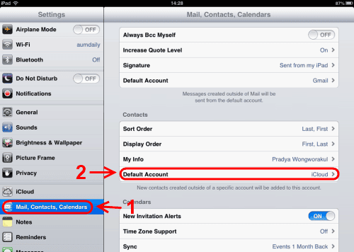สมมุติเมื่อคุณได้เบอร์โทรเพื่อนใหม่ โดยเพิ่มรายชื่อบน iPhone ของคุณแล้ว และอยากให้รายชื่อใหม่นั้นเพิ่มบน Android ไปโดยอัตโนมัติด้วย คุณจะต้องตั้งให้ My Phone2 For Gmail ที่สร้างขึ้นไว้นี้เป็นบัญชีเริ่มต้นของคุณก่อน โดยทำตามขั้นตอนดังนี้
