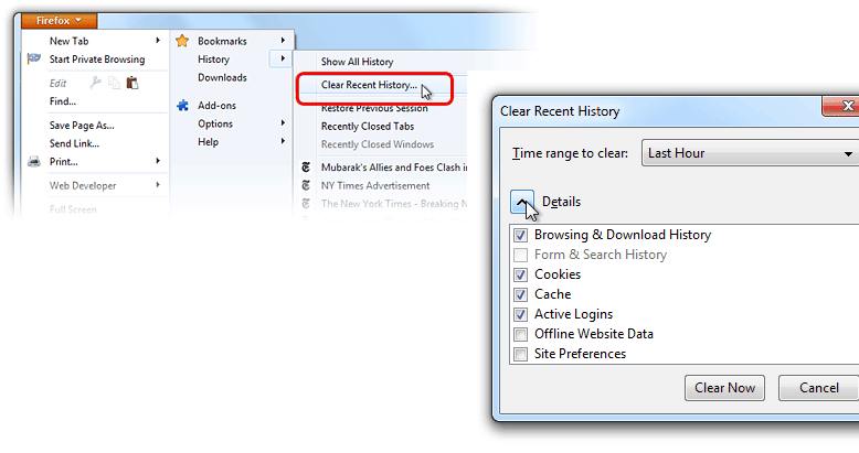 แตะที่คำว่า Firefox ตรงมุมบนซ้ายมือ จากนั้นเลือก History แล้วไปที่ Clear Recent History … แล้วแตะที่ Detail จากนั้นเลือกว่าอยากลบอะไรบ้าง … สามารถเลือกจาก Dropdown Menu เพื่อระบุได้ด้วยว่าอยากลบข้อมูลเก่าแค่ไหน