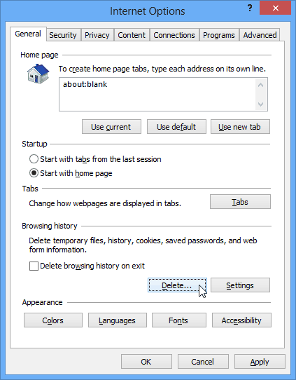 คลิกที่ไอคอนรูปเฟือง (อยู่ใต้เครื่องหมาย x อีกเช่นกัน) แล้วเลือก Internet Options จากนั้นในหัวข้อ Browsing History คลิกที่ Delete แล้วเลือกเลยว่าจะลบอะไรออกบ้าง แค่นี้ก็เรียบร้อย