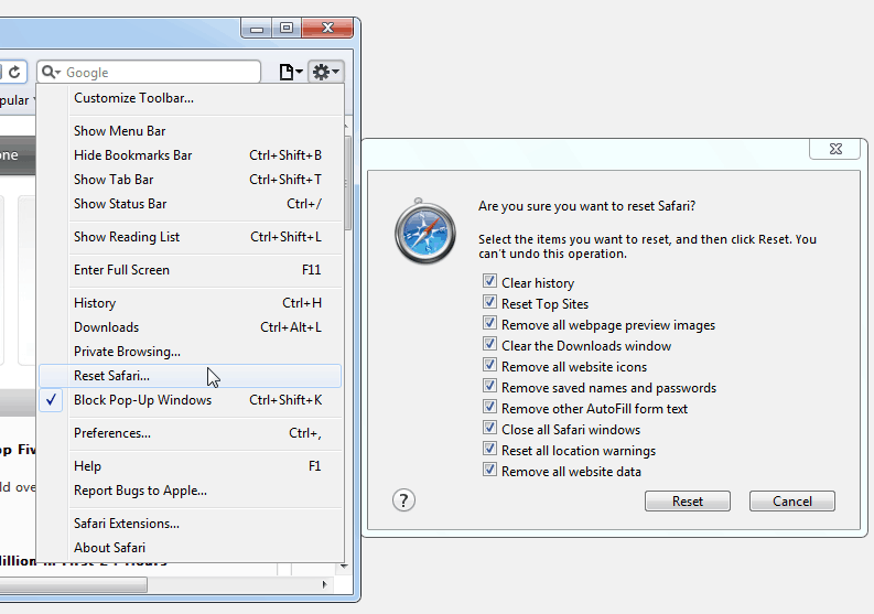 กรณีของ Safari เลือกที่ “Reset Safari” ดังรูป พอเลือกหัวข้อนี้แล้ว เราจะเลือกได้ว่าอยากลบข้อมูลอะไรออกบ้าง