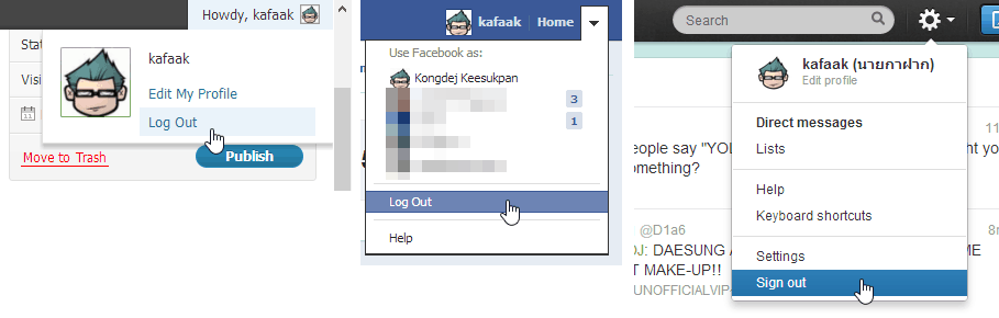 ทุกบริการในเว็บไซต์ที่เป็นระบบ Login หรือ Sign in เมื่อเข้าสู่ระบบแล้ว จะมีลิงก์ หรือ ปุ่ม ให้ Logout หรือ Sign Out อยู่นะครับ ดังนั้น เมื่อใช้บริการเว็บไซต์นั้นๆ เสร็จแล้ว ควรจะ Logout หรือ Sign Out ด้วย … ถ้าเป็นเครื่องคอมพิวเตอร์ของคุณเอง และมั่นใจว่าไม่มีใครมาใช้ร่วมด้วยแน่ๆ จะไม่ Logout หรือ Sign Out เพื่อความสะดวกในการใช้บริการ แต่ถ้าเป็นกรณีใช้คอมพิวเตอร์ที่อินเทอร์เน็ตคาเฟ่ นี่คือสิ่งที่คุณควรทำทุกครั้ง!!!