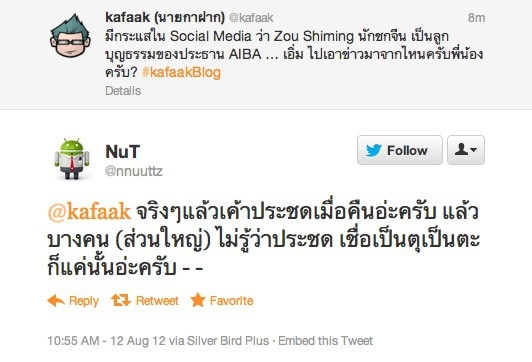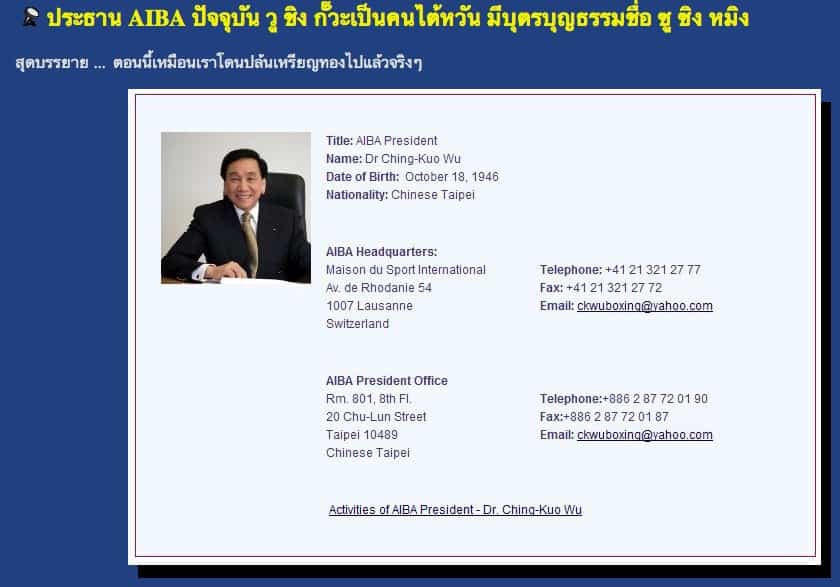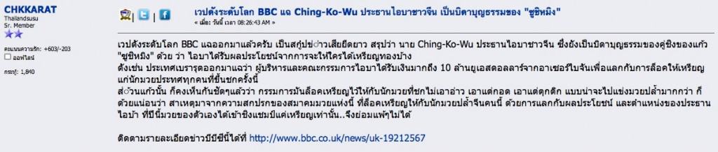 แต่ Follower ของผมท่านหนึ่งคือ @tannce เขาเอาข้อความโพสต์จากเว็บบอร์ดมาให้ดูครับ ว่าข้อมูลน่าจะมาจากเว็บบอร์ด Thailandsusu.com ครับ เขามีการอ้างอิงว่าสำนักข่าว BBC แฉเป็นสกู๊ปข่าวว่า ประธาน AIBA คือ Ching-Ko-Wu เป็นพ่อบุญธรรมของ Zou Shiming ที่เป็นคู่ชกของ แก้ว พงษ์ประยูร