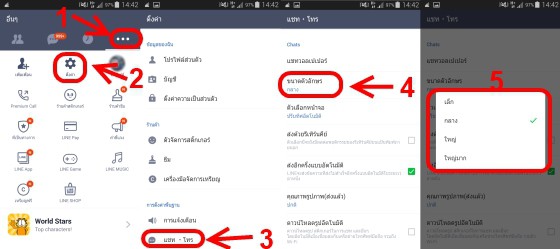 ในส่วนผู้ใช้ Android และใช้แอพ Line หน้าตาภาษาไทย ก็สามารถปรับขนาดตัวอักษรให้ใหญ้ขึ้นเพื่อสะดวกในการอ่าน Line ได้เช่นกัน โดยเปิดแอพ Line แล้ว เลือกแท็บไอคอน 3 จุด แล้วเลือกที่ ตั้งค่า >> จากนั้นเลือก แชท . โทร >> เลือก ขนาดตัวอักษร แล้วเลือกขนาดอักษรระหว่าง เล็ก กลาง ใหญ่ ใหญ่มาก ตามต้องการ (ดูภาพด้านล่าง)