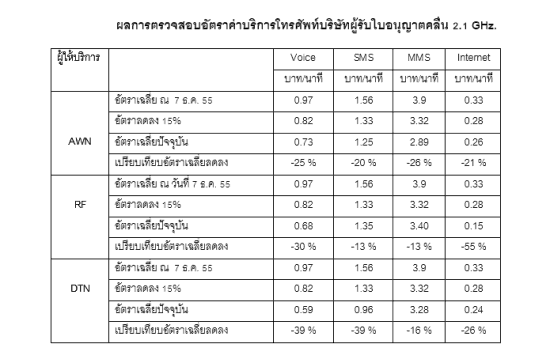 ทั้งนี้เมื่อวันที่ 26 กรกฎาคม 2556 AIS ได้รายงานโครงสร้างและอัตราค่าบริการโทรคมนาคมประจำเดือนกรกฎาคม 2556 มีรายการส่งเสริมการขายทั้งหมด 316 รายการ แบ่งเป็นรายการส่งเสริมการขายในระบบ Postpaid 131 รายการ Prepaid 91 รายการ และ Ontop 88 รายการ พบว่าค่าบริการได้ลดลงมากกว่า 15% ตามเงื่อนไขใบอนุญาต