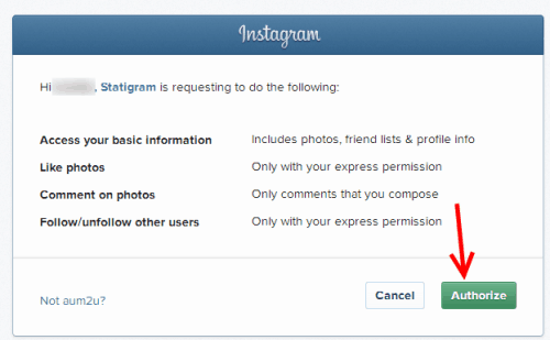 คลิกที่ Authorize เพื่อให้เว็บไซต์ Statigram เข้าถึงข้อมูลรูปเพื่อประมวลภาพสถิติการ Like ต่างๆ