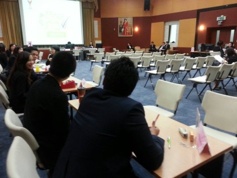 - เริ่มจาก ผู้ประสงค์จะเข้าร่วมการประมูลจะเข้ามารับบัตรคิว ณ จุดประชาสัมพันธ์ ซึ่งจัดอยู่บริเวณหน้าห้องประชุมชั้น 2 อาคารหอประชุม จากนั้นเดินเข้าไปยัง จุดที่ 1 ซึ่งเป็นจุดลงทะเบียนซื้อเอกสารการประมูล ซึ่งอยู่ในห้องประชุม ภายในอาคารหอประชุมชั้น 2 โดยผู้ประสงค์จะซื้อซองประมูลจะต้องยื่นเอกสารซึ่งประกอบด้วย แบบข้อมูลใบเสร็จ สำเนา ภ.พ. 20 (ใบจดทะเบียนภาษีมูลค่าเพิ่ม) หรือสำเนาหนังสือรับรองนิติบุคคล และบัตรคิวที่ระบุหมวดหมู่เอกสารการประมูลที่ต้องการจะซื้อ ให้เจ้าหน้าที่ตรวจและคีย์ข้อมูล