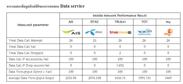 ผลสรุปการทดสอบครั้งนี้ ด้าน Data ทุกค่ายมีคะแนนเต็ม 100% ในขณะที่ความเร็วเฉลี่ยการทดสอบเครือข่าย Mobile Internet (3G) รอบนี้ AIS ทำความเร็วเฉลี่ยอยู่ที่ 2531.040 Kbps ขณะที่ ดีแทคเฉลี่ยประมาณ 2 Mbps, True Move H 1.4Mbps, TOT 1.9 Mbps, My by CAT 1.46 Mbps