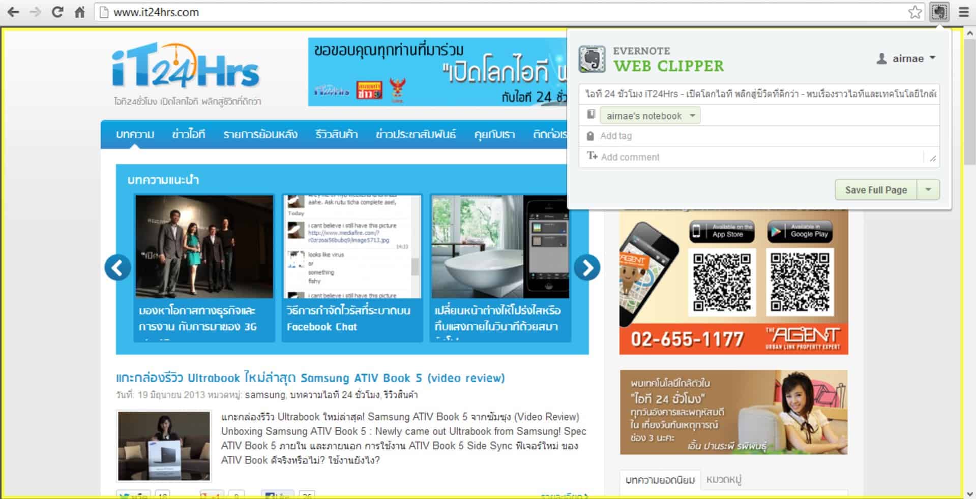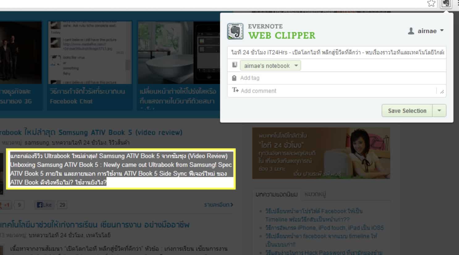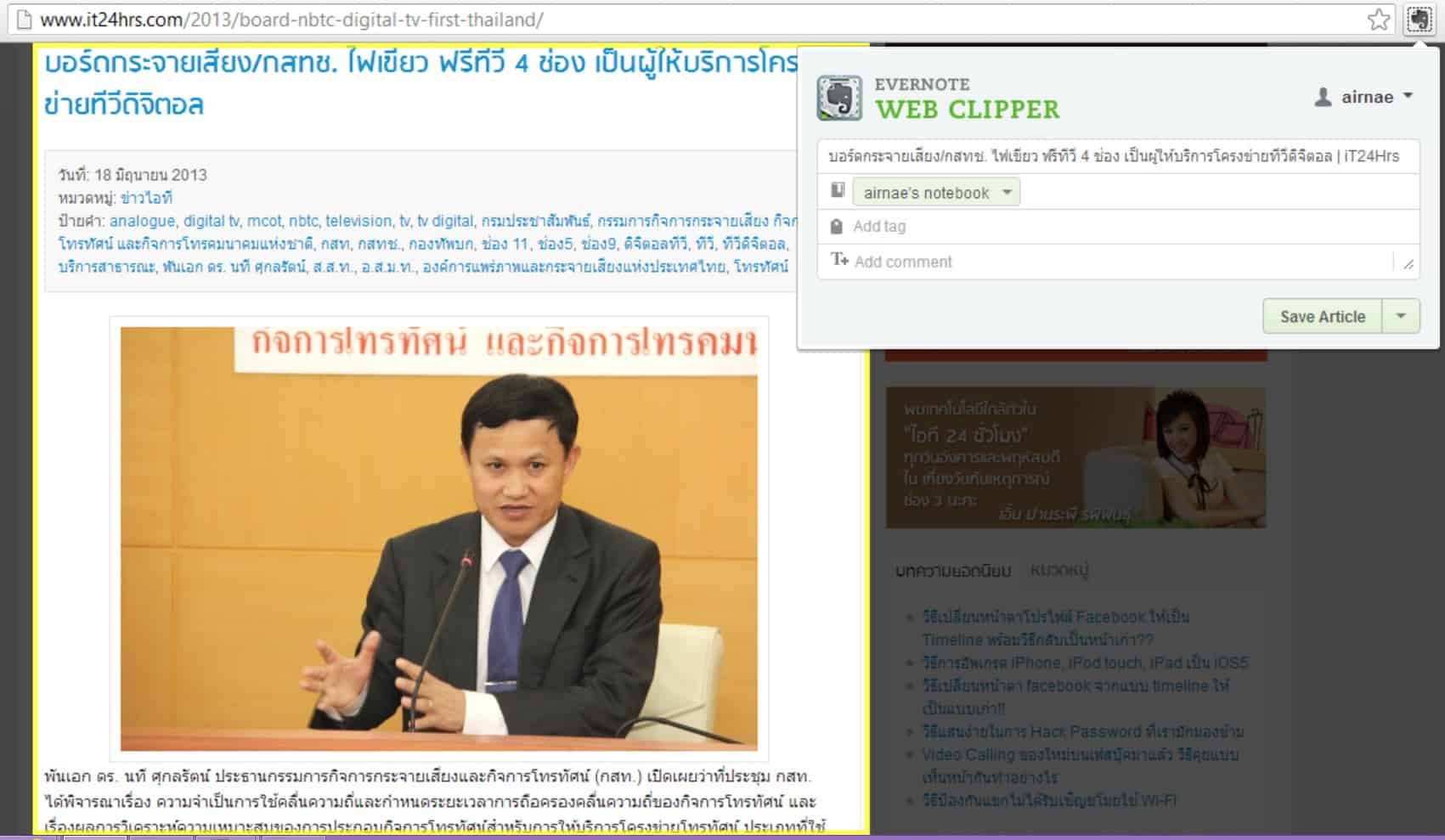 หากคุณกำลังอ่านบทความ ท่องเว็บไซต์ แล้วเจอรูปภาพ ข้อความหรือสิ่งที่น่าสนใจอยากบันทึกเก็บไว้ วิธีทั่วๆไปที่คนส่วนมากมักจะทำ คือการ save เว็บไซต์ , copy ข้อความใส่ Word หรือหากต้องการเก็บไว้อ่านในอุปกรณ์อื่นก็จะ copy url แล้วส่งเป็น Email ให้ตัวเอง ซึ่งแต่ละวิธีก็ค่อนข้างยุ่งยากและมีขั้นตอนมากทีเดียว แต่ตอนนี้เรามีวิธีจัดการบันทึกสิ่งที่เราต้องการบนเว็บ เก็บไว้อ่านง่ายๆ ด้วย Evernote Web Clipper