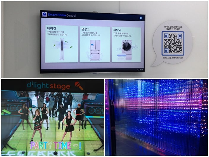 วันที่ 2 ของการเดินทางคณะศึกษาดูงานได้เดินทางไปยัง Samsung D’Light หนึ่งในบริษัทยักษ์ใหญ่ของเกาหลีและของโลก ซึ่งก็มีหลากหลายเทคโนโลยีที่น่าสนใจ เมื่อเข้ามายังชั้นแรก เราจะพบกับเวที Virtual D’light Stage ที่เมื่อไปยืนบนจุดที่เซ็นเซอร์ทำงาน บนจอก็จะแสดงลูกเล่นที่หลากหลาย ให้เรามีส่วนร่วมกับบนจอนี้เช่น ให้คุณเป็น Dancer , Movie Star เป็นต้น ซึ่งในส่วนของชั้นแรกนี้จะเป็นการโชว์อุปกรณ์ต่างๆของซัมซังเช่น ทีวี กล้อง โทรศัพท์เป็นต้น ในส่วนของชั้นที่ 2 จะถูกแบ่งเป็นโซนต่างๆได้แก่ โซน LED Lighting Drums ซึ่งแสดงไฟ LED ที่อยู่ภายในจอโทรทัศน์ โซน Smart Electricity ห้องที่จำลองบ้านที่ควบคุมทุกอย่างผ่านสมาร์ทโฟน เช่นตู้เย็น เครื่องซักผ้า ทีวี โดยสามารถดาวน์โหลดแอพพลิเคชั่น Smart Home เพื่อควบคุมการใช้งาน ต่อมาเป็นโซน Education หรือห้องที่จำลองการเรียนโดยใช้แท็บเล็ต คุณครูสามารถควบคุมการสอน ดูรายชื่อนักเรียน หรือทำแบบทดสอบและวัดผลได้ทั้งหมดผ่านแท็บเล็ต ซึ่ง Samsung ได้สนับสนุนทั้ง Hardware และ Software ให้ใน 31 โรงเรียนในเกาหลีและอีก 27 ประเทศนอกจากนี้ยังมีการโชว์โทรทัศน์ที่สามารถรับชมได้พร้อมกัน 2 คน ผ่านอุปกรณ์แว่นตา ที่เมื่อกดปุ่มก็จะแสดงช่อง 1 ช่อง พร้อมเสียงออกมาจากแว่นให้รับชม หากสามีหรืออยากดูบอล หรือภรรยาอยากดูละครก็สามารถรับชมร่วมกันได้ผ่านทีวีเครื่องเดียว ซึ่งตอนนี้ก็มีวางจำหน่ายแล้วในเกาหลี