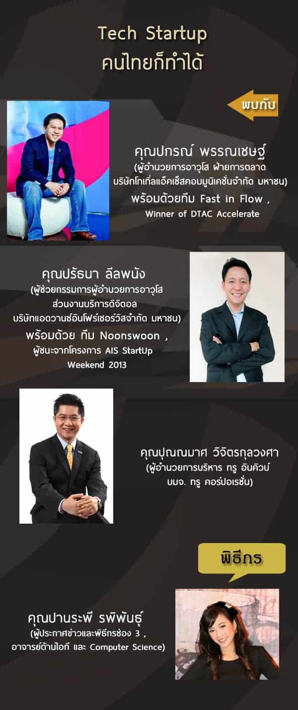 เราจึงจัดการบรรยายพิเศษนี้ขึ้น โดย DTAC TRUE และ AIS ซึ่งต่างก็พยายามช่วยเหลือ ผลักดัน คนไทยให้ก้าวสู่การเป็น Tech Startup อย่างจริงจังโดยตลอด ผ่าน โปรเจค DTAC Accelerate, True Incube และ AIS StartUp Weekend แต่นี่เป็นครั้งแรกที่ทั้งสามค่