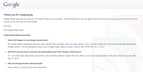 แต่ทั้งนี้บริการ Backup feed บน Google Reader นี้ ใช้ได้ถึงวันที่ 15 กรกฎาคมนี้ และหลังจากนั้นจะลบข้อมูลที่เคยใส่ไว้ใน Google Reader ทั้งหมด เป็นการปิดฉาก Google Reader บริการ Feed ข่าวยอดฮิตอย่างถาวรไม่มีวันกลับ