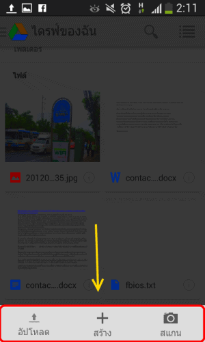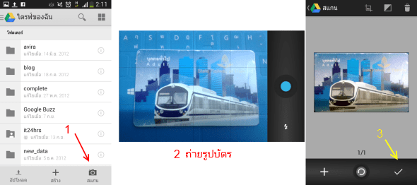 - สแกน เป็นการสแกนเอกสาร โดยถ่ายรูปด้วยมือถือ เพื่อจับเอกสารเช่น นามบัตร หน้าหนังสือ มา save บันทึกลงบน Google Drive