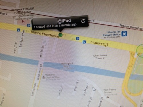 ตัวอย่างนี้เกิดขึ้นกับผู้โดยสารรถแท็กซี่ท่านหนึ่ง ที่โดยสารรถแท็กซี่กลับบ้านในคืนวันหนึ่ง แต่ปรากฏว่า เมื่อเข้าบ้านไปแล้ว ผ่านไปเป็นชั่วโมงๆ ถึงได้รู้ตัวว่า ตนเองลงจากรถแท๊กซี่ โดยลืม iPad ไว้บนรถแท็กซี่คันนั้น…..ทันทีที่รู้ตัว ก็รีบโทรหาเพื่อนร่วมงานเพื่อให้ช่วยลองตามหา เมื่อเพื่อนร่วมงานท่านนี้ได้รับโทรศัพท์ ในขณะที่นั่งดูหนังอยู่บ้าน ก็รีบเปิดเว็บไซต์ icloud.com ขึ้นมาทันที พร้อมใส่ Apple ID ที่ได้ลงทะเบียนไว้ และใช้กับเครื่อง iPad ที่ต้องการตามหานั้น…..เมื่อ login เข้าไปได้ ก็เข้าไปที่ Find my iPhone บนหน้าเว็บ ก็แสดงแผนที่ พร้อมทั้งพิกัดที่อุปกรณ์ที่ต้องการตามหานั้นอยู่ และทำการกด refresh ไปเรื่อยๆ เพื่อดูตำแหน่งของ iPad เครื่องนั้น ทุกๆ 1 นาที….และโทรศัพท์คุยกันกับเจ้าของ iPad เพื่อคอยบอกพิกัดของ iPad ที่เคลื่อนที่ไปเรื่อยๆนี้ โดยเจ้าของ iPad ท่านนี้ ก็นั่งแท็กซี่อีกคันตามไปตามพิกัดที่บอกเรื่อยๆ วนไปมา ตามถนนต่างๆ ใช้เวลาตามอยู่ 3 ชั่วโมง….จนกระทั่งไปถึงซอยสุขุมวิท 22 …..แต่ทว่า เมื่อไปถึง พิกัดดังกล่าว ก็พบว่า ละแวกนั้นมีรถแท็กซี่อยู่ถึง 4 คัน! เจ้าของ iPad จึงได้เริ่มต้นถามที่คันแรก ปรากฏว่าโชคดี ถูกคัน ตั้งแต่คันแรก และได้คืนในที่สุด!