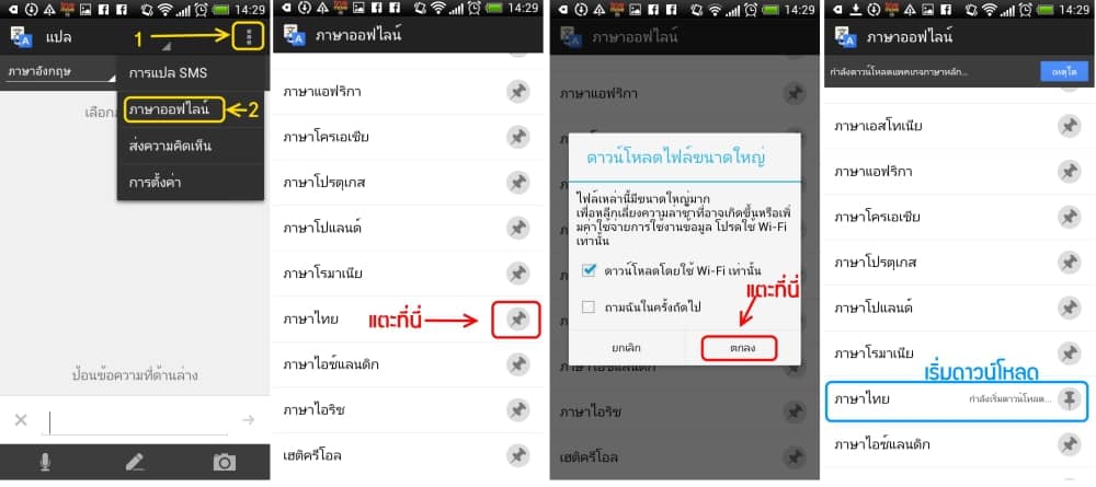 เลือกที่เมนู ตรงมุมขวาบน (ตามหมายเลข 1) จากนั้นเลือก ภาษาออฟไลน์ แล้วเลือกเข็มหมุดที่ภาษาไทย เพื่อติดตั้งภาษาไทยแบบออฟไลน์ ซึ่งต้องใช้ปริมาณข้อมูลจำนวนมากถึง 180MB ดังนั้นแนะนำให้ดาวน์โหลดผ่านทาง Wi-Fi ดีกว่า เพื่อให้การดาวน์โหลดมีประสิทธิภาพและประหยัดค่า 3G ด้วย