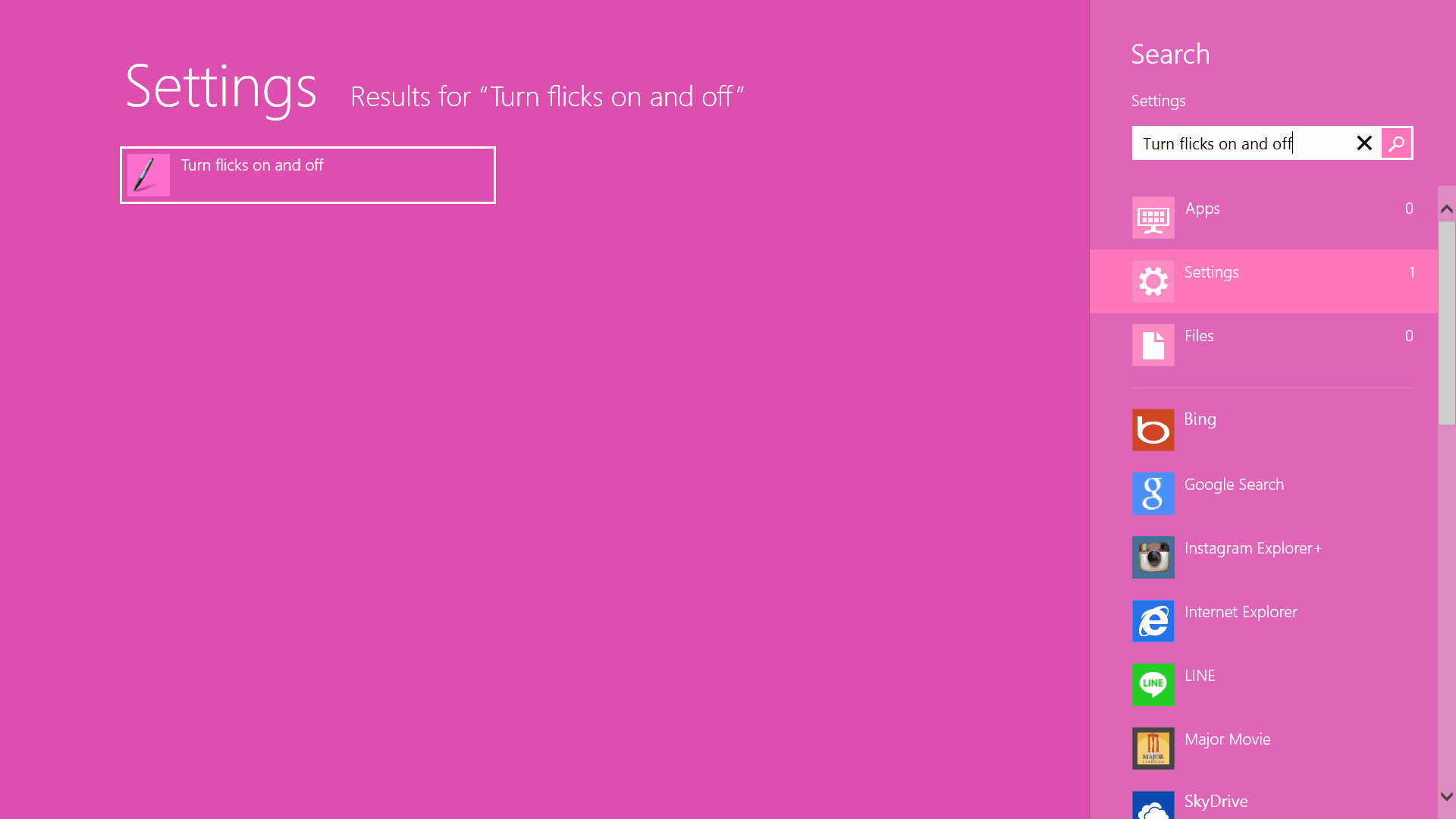 - เลือก setting แล้วพิมพ์คำว่า Turn flicks on and off