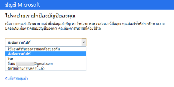 จากนั้นมันจะถามรหัสตัวที่ 2 โดยมีเมนู drop down ว่าจะให้ Microsoft ส่งโค้ดลับไปหาคุณทางไหน
