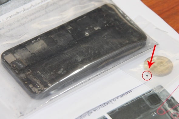 สำนักงาน กสทช. ตรวจสอบพบรอยสีขาวบริเวณมุมของตัวเครื่องโทรศัพท์ ตามที่บริษัท Exponent แจ้งผล ในส่วนของสกรูห้าแฉก 2 อัน ที่ติดอยู่กับตัวเครื่องโทรศัพท์ซึ่งทางบริษัท Exponent พบว่า 1 ใน 2 อันนั้นมีร่องรอยขีดข่วนและผิดรูปในเชิงเครื่องกล แสดงว่าอาจมีการเปิดเครื่องก่อนที่ Exponent จะได้รับ เนื่องจากสำนักงาน ได้รับเครื่องโทรศัพท์คืนในลักษณะที่เครื่องถูกแยกเป็นชิ้นส่วนจึงได้ตรวจสอบชิ้นส่วนสกรูที่ Exponent อ้างถึงและตรวจสอบจากภาพวิดีโอที่บันทึกการตรวจสอบของบริษัทที่ปรึกษาอิสระ โดยพบร่องรอยผิดรูปไปจากเดิมจริง และไม่อาจระบุได้ว่าร่องรอยดังกล่าวเกิดขึ้นก่อนที่ผู้ใช้งานประสบเหตุการณ์หรือไม่