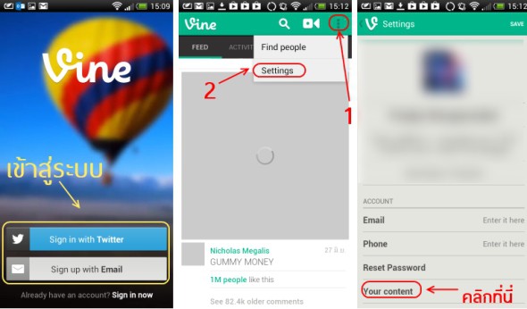 เริ่มจาก หยิ่บมือถือ หรือแท็บเล็ต ระบบปฏิบัติการ iOS หรือ Android เปิดแอพ Vine ทำเข้าสู่ระบบให้เรียบร้อย แล้วเลือกไปที่ Setting ดังรูป ด้านบน จะเข้าสู่หน้าตั้งค่า ให้ไปแตะที่ Your Content เพื่อจัดการความเป็นส่วนตัว