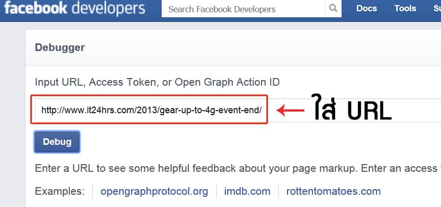 2. คลิกเข้าไปที่ Facebook Debugger แล้วนำลิงก์ที่ Copy มาวางไว้ในช่องว่างนี้ จากนั้นคลิกปุ่ม Debug