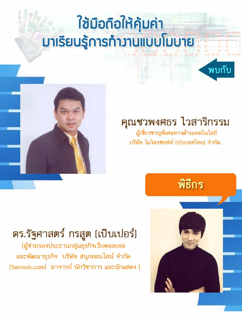 หัวข้อ : ใช้มือถือให้คุ้มค่า เรียนรู้การทำงานแบบโมบาย (16.00-18.00 น.)