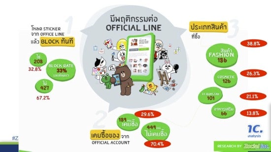 - มีข้อมูลที่น่าสนใจว่าคนไทยมีพฤติกรรมชอบโหลดสติ๊กเกอร์ฟรี โดยคนไทย add ผ่านทาง Official Account แล้วโหลดสติ๊กเกอร์ฟรี แต่เมื่อโหลดได้สติ๊กเกอร์เสร็จแล้ว ก็ Block ข้อความ Official Account นั้นทันที