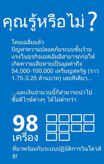 • หรือจะใช้ Windows Xp และ Office 2003 ต่อไป แต่ต้องตกอยู่ในความเสี่ยงจากภัยคุกคามทางคอมพิวเตอร์และอินเทอร์เน็ตขั้นร้ายแรง