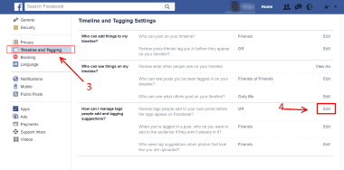 ขั้นตอนการคุม tag ของ facebook คือ ให้ไปที่บริเวณมุมขวาบนของเว็บ facebook จะพบไอคอนสามเหลี่ยม ในลักษณะชี้ลง แล้วเลือกที่ settings (หรือเข้าไปโดยตรงที่ www.facebook.com/settings )