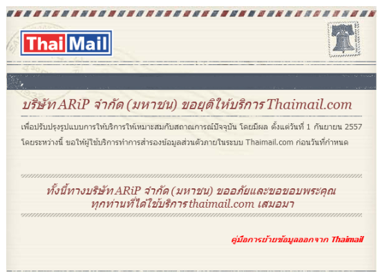 ด้วยเทคโนโลยีที่เปลี่ยนแปลงไปอย่างรวดเร็ว ประกอบกับ ทั้ง Hotmail yahoo และ gmail ที่ให้บริการฟรีอีเมลแล้ว สามารถ login ใช้บริการ service อื่นๆได้ จนคนไทยไม่ค่อยได้ใช้บริการฟรีอีเมลไทยนัก จนล่าสุดทาง ARIP ผู้ให้บริการฟรีอีเมลไทยรายแรกในประเทศไทย Thaimail.com ประกาศเตรียมปิดตัวลง มีผลวันที่ 1 กันยายน 2557 ที่จะถึงนี้ เตือนผู้ใช้บริการอีเมล thaimail ให้ทำการย้ายจดหมายสำคัญออกจากระบบด่วน ทั้งนี้ในตัวเว็บไซต์ thaimail ได้ทำคู่มือขั้นตอนการย้ายจดหมายออกจาก Thaimail ไว้ให้แล้ว