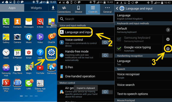 เข้าไปที่ setting บนตัวมือถือ Android >> เลือก Language And Input >> เลือกที่ไอคอนตั้งค่า ตามรายการ Google Voice Typing (ตามหมายเลข )