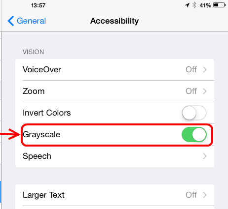 แค่นี้ก็จะได้โทนสีเป็นโทนสีเทา แล้ว และถ้าเลือกจาก หมวด Accessibility เปิดที่ Inverts Colors จะเป็นโหมดโทนมืดขาวดำ สำหรับคนตาบอดสีด้วย แน่นอนฟีเจอร์นี่หลายท่านยังไม่ทราบว่ามีแบบนี้ใน iOS8 ด้วย